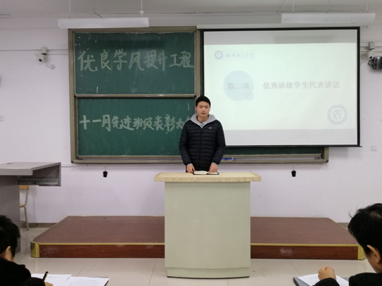 接着,我院副院长吴奇宣读了关于十一月优秀班级的决定,对十一月的优秀班级进行了奖励,各位老师给各优秀班级颁发了奖品,吴院长希望各个优秀班级能够继续保持积极向上的学习风气,继续努力,为学院的学风提升工程做出表率。