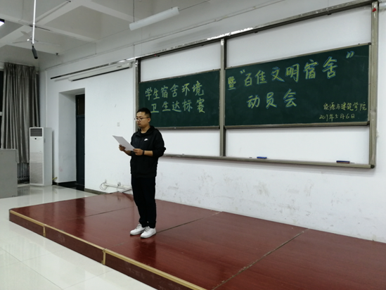 会上,周俊屹老师上台宣读了我校关于开展学生宿舍环境卫生达标赛暨“百佳文明宿舍”通知,他带领学生对达标赛流程及评判标准等各项细节进行了详细的学习和解释。他提出,我校本次开展卫生达标赛的目的不仅是为了培养学生养成良好学习及生活习惯,营造环境卫生良好,人际关系友好,学习氛围浓郁的“学生文明之家”,更是体现我院优良学风建设以及创建党员示范宿舍,以党建工作引领学生工作。在达标赛期间,学生会将每天进行抽查,确保卫生无死角。