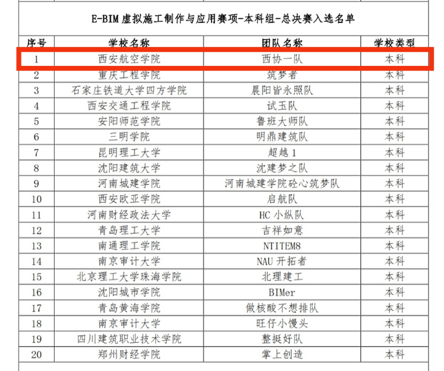 近日,2023年“鲁班杯”全国高校BIM毕业设计大赛全国预选赛落下帷幕,代表我校参赛的西协一队和航鹰启航队分别以本科组全国第一名和第八名的优异成绩入选总决赛晋级名单。