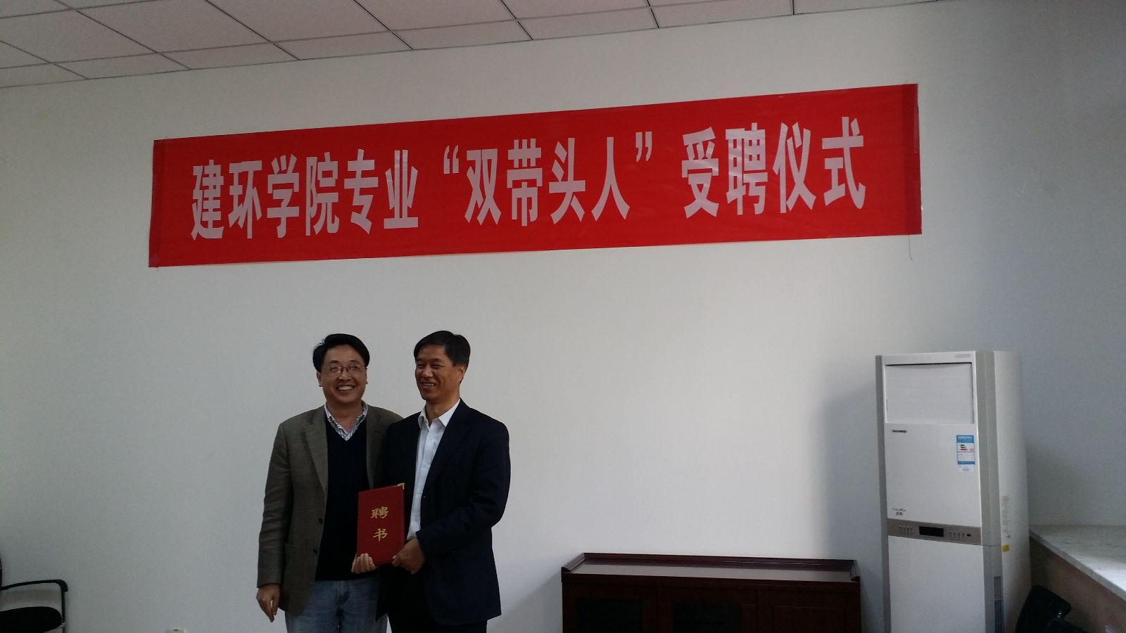 4月15日下午,建筑与环境学院在教南三楼会议室举行专业“双带头人”受聘仪式。副校长曹庆年代表学校为西安市建筑设计研究院教授级高工吕砚昭和中航工业618研究所教授级高工王乾虎颁发专业带头人聘任证书。聘任仪式由副院长雒新峰主持,院领导、室主任、副高以上职称教师及骨干教师参加。