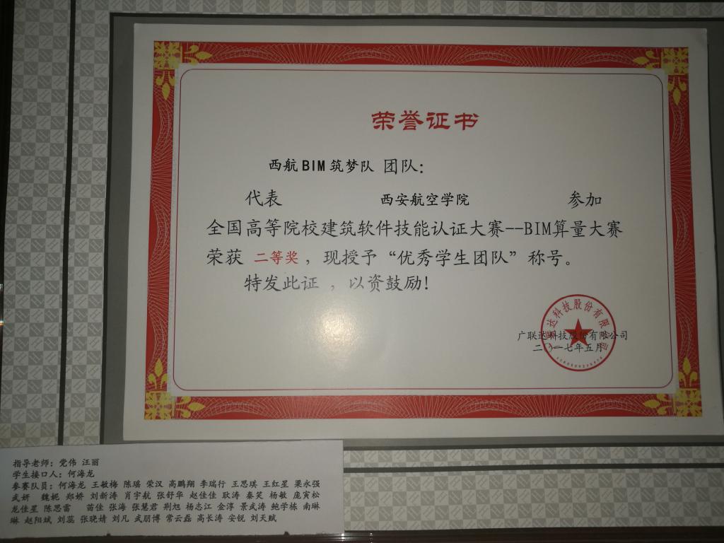 为了响应《国家中长期人才发展规模纲要(2010-2020年)》中关于“统筹推进高技能人才队伍建设”的号召,进一步帮助院校培养有较强应用技能的学生,广联达科技股份有限公司教育培训事业部举办了第四届“全国高等院校建筑软件技能认证大赛-BIM算量”。2017年5月14日共有来自全国293所高校(本科148所,专科145所),376支团队的10024名学生报名并完成了比赛。本次大赛由党伟、汪丽、李华志、裴蕾作为指导老师,何海龙,王敏梅作为学生接口人,共同带领“西航BIM筑梦队”和“西航BIM追梦队”参加了本次大赛本科组BIM算量认证大赛,并从全国148所高校中脱颖而出,“西航BIM筑梦队”荣获全国二等奖,“西航BIM追梦队”荣获全国三等奖的优异成绩。