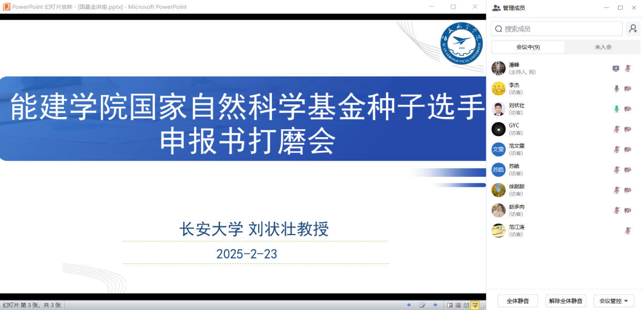 会上,长安大学刘状壮教授结合国家自然科学基金最新政策导向和评审趋势,系统剖析申报书撰写要点。强调了要注重申报书逻辑链条的严谨性和文本表达的精准度,逐一对每位教师的题目标题、框架结构、核心内容及细节规范进行细致点评及指导,既指出共性问题,如科学属性阐述不足、研究方案可行性论证薄弱等,又结合学科特点提出个性化修改建议,为申报人指明优化方向。各位教师对撰写过程中的疑惑和问题与刘教授展开深入探讨。