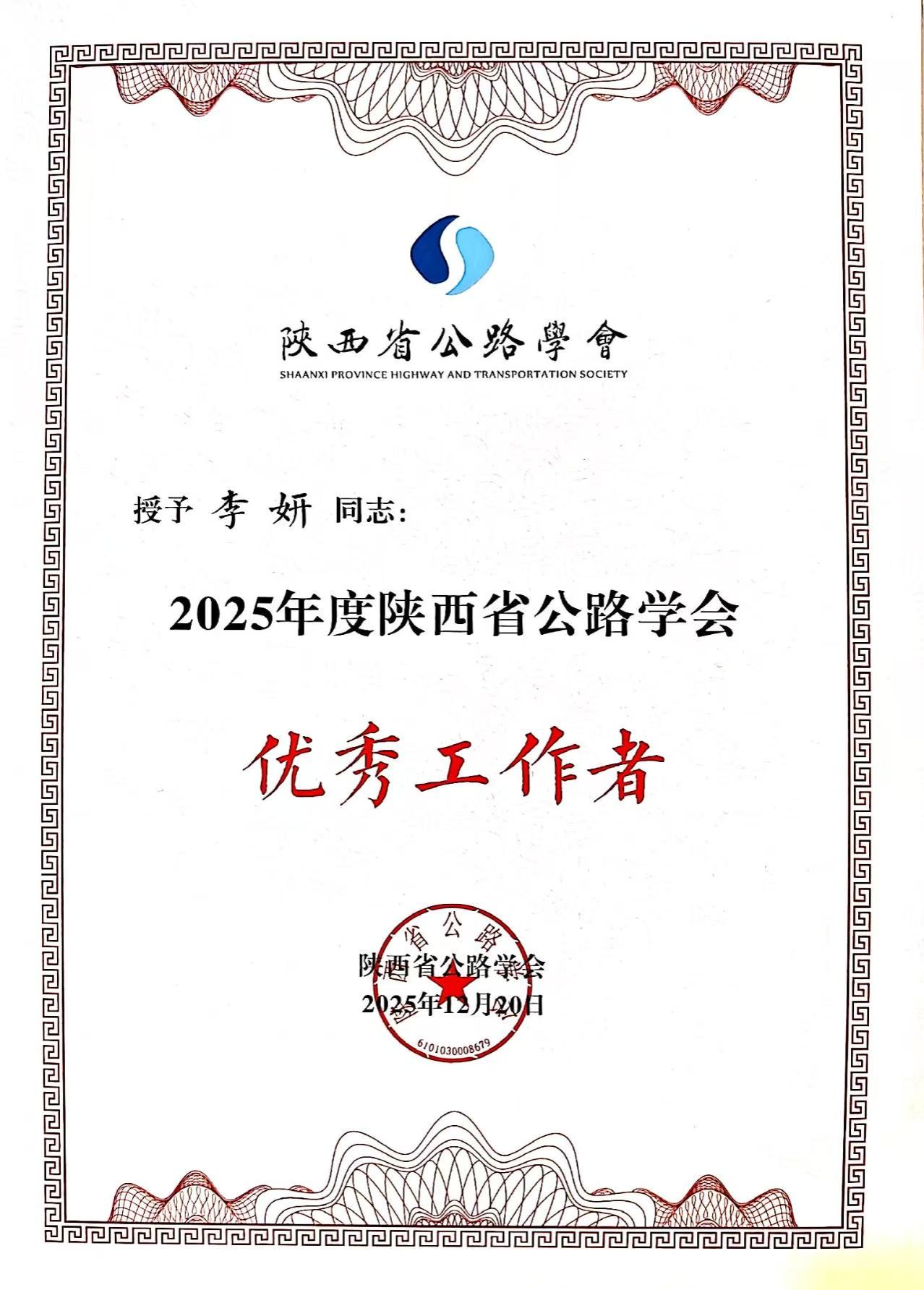 近日,陕西省公路学会发布《关于表扬2025年陕西省公路学会优秀工作者的决定》,伟德国际VICTOR1946李妍老师荣获“2025年度陕西省公路学会优秀工作者”。展现了学院在积极服务交通运输行业,推动科技创新与产学研融合方面取得的积极贡献。