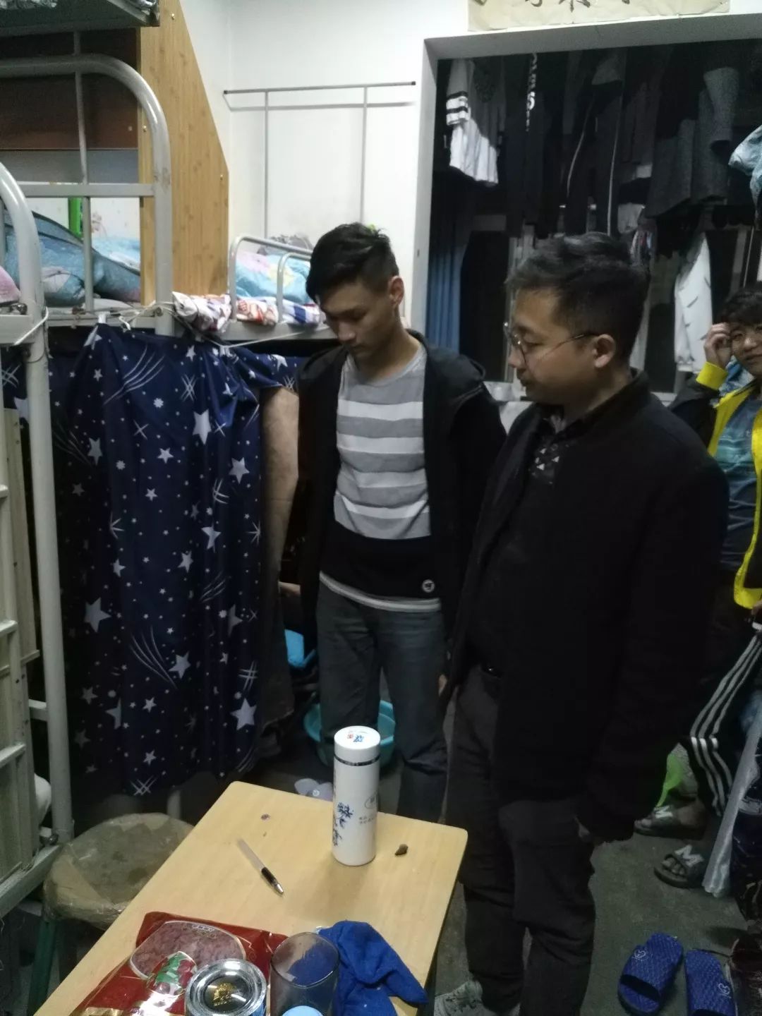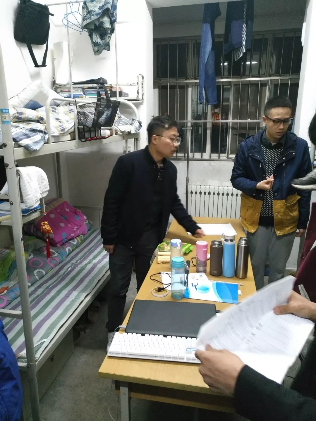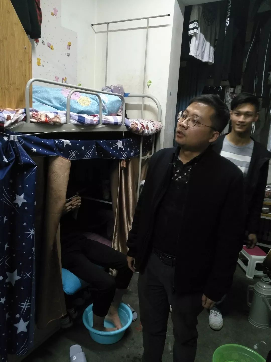 走进宿舍,周老师就同学生们开展了春季宿舍卫生安全方面的交流,周老师要求,新学期同学们不能在宿舍安全方面有所懈怠,在新学期初必须加强自己生活上用火用电安全防范意识,并强调舍长履行自身义务,切实落实学院宿舍安全有关规定,及时发现问题并解决问题。周老师还强调了卫生方面的问题,平日生活物品需摆放有序,个人卧具要整理整齐,并告诉同学们定期大扫除,提醒同学们及时清理地面及桌面垃圾。
