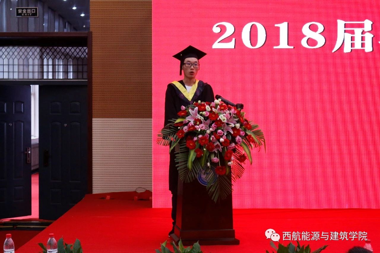 我院张富康同学作为毕业生代表上台做了发言。张富康首先向学校和学院的老师们表达了真诚的感谢,感谢学校提供的平台和机会,感谢老师们的辛勤培育和教导,感谢同伴们的一路相伴。随后,他回顾了母校的辉煌建设和飞速发展以及学院的成长变迁和蓬勃发展;讲述了自己四年来在学业上学到的专业知识与技能,比赛上取得的荣誉和成绩;回忆了自己在母校四年来生活的点点滴滴,结识的志同道合的好友,收获的纯真友谊。最后,他祝福母校:人才辈出!桃李芬芳!他向母校再次表达了感谢之情,表达了对母校的依依不舍之情。