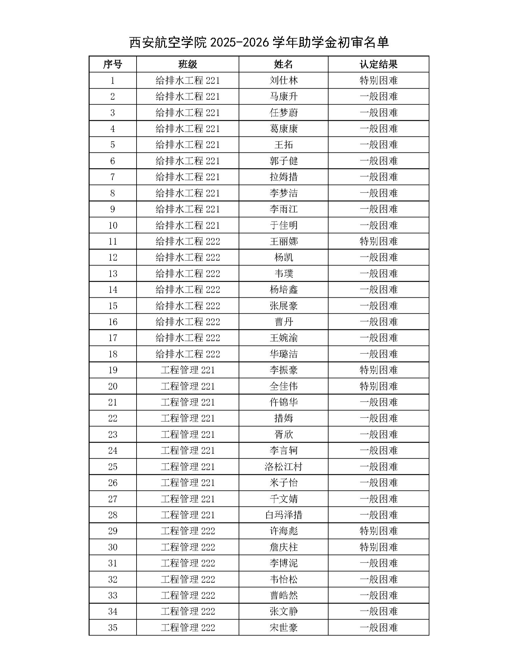 根据《伟德国际唯一本专科生国家助学金实施办法》(西航院字〔2023〕60号)、《关于开展2025—2026学年本专科生国家助学金评审工作的通知》(西航学字〔2025〕41号)等文件要求,经班级民主评议认定,伟德国际VICTOR1946学生资助工作评审小组审核,现将评选结果进行公示,名单如下。