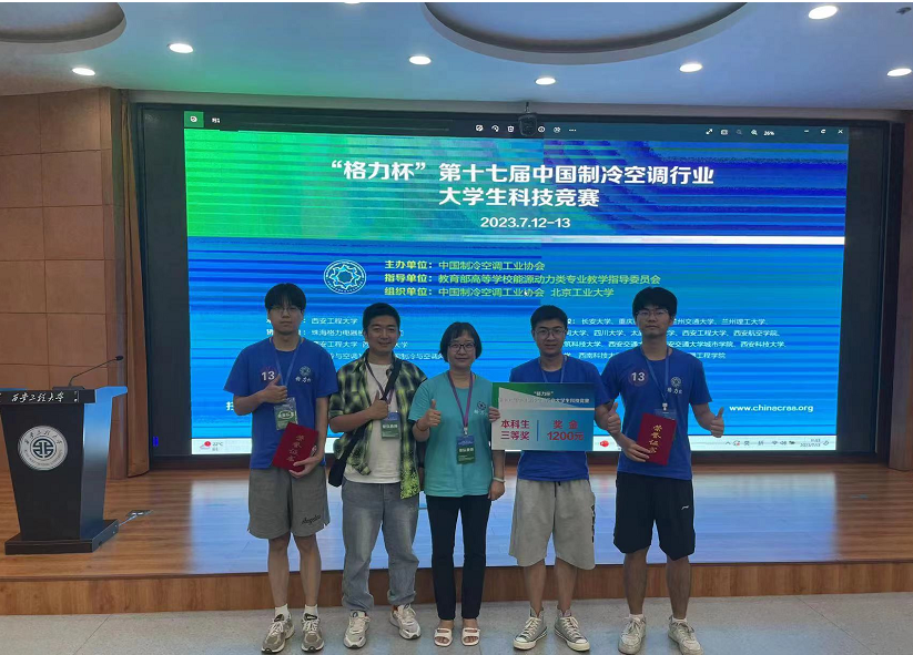 2023年7月12日-2023年13日,“格力杯”第十七届中国制冷空调大学生科技竞赛在西安工程大学拉开了帷幕,我校伟德国际VICTOR1946积极响应中国制冷空调工业协会号召,由杜芳莉、申慧渊老师带队,杨洪智、赵益锟、李泊论三位同学组成的“数林精灵队”赴西安工程大学参加决赛,并荣获本科生组三等奖的优异成绩,充分展现了我校师生的精神风貌与意志品质。